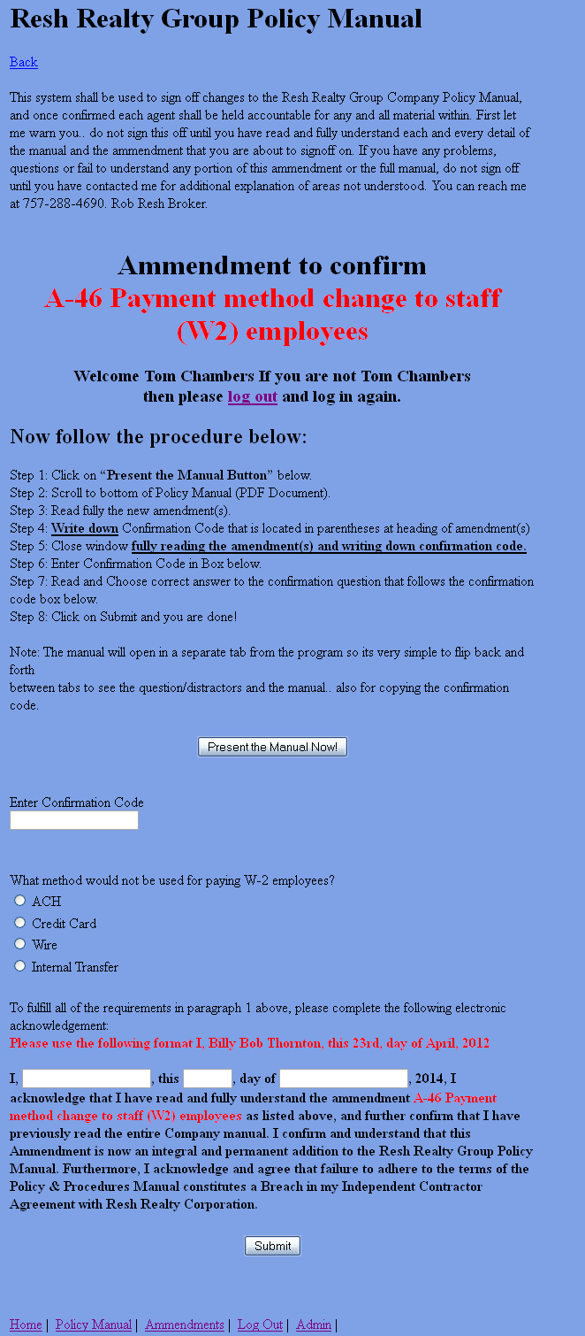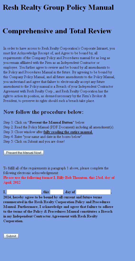 7. Full Review Policy Manual IF you do not have time to review the entire manual at this point, you can come back at later times to complete the review. However until you have reviewed and accepted the entire manual you will not be granted access to the Intranet. Please understand that the instructions here detail your day to day activity as you go about representing Resh Realty Corp. and must be strictly adherred to in your day to day operations. You must complete the initial review as soon as practical and prior to performing as a representative for the Resh Realty Corp. Please be aware that the broker gets a report each 24 hours on any agent that has not completed the review. Once the review is complete and signed off you will be able to access the Intranet. The full manual will be provided for you here on the Intranet so that you may access it at any time that you may have questions. I highly encourage you to use the Policy Manual to look up any areas that you may have forgotten about. If at anytime you have questions that are not fully explained in this manual please call Bill Loftis or myself. All policies laid out in the manual are expected to be carried out in full and without question. Ok.. lets get the from below filled out... follow the step by step instructions to complete the form. ![]()