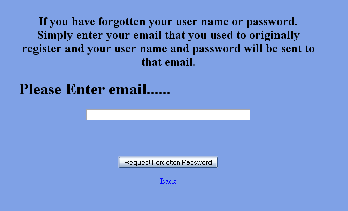 3. Forgot Password Screen Obviously all you need to do is enter your email and the system will send your user name and password to the email that you have listed in the data base.. so be sure you enter the same email that you registered with. If you do not know your email call Bill Loftis.. and DO NOT set up a new account with a new email. Course you cannot set up another account using the same email since it can detect that and will reject it. ![]()